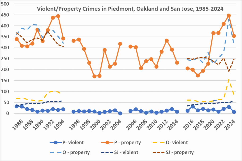 Is that true? The figure below shows violent and property crime data for Piedmont, Oakland and San Jose for the past 40 years ( California DOJ ). First, rates for Oakland and San Jose are scaled to appear on the same axis as Piedmont – for both cities and both types of crime, rates in those cities are 100-fold greater than Piedmont. Rates for Oakland and San Jose declined over that time period by 25%, by 40% when the COVID spike is factored out. For Piedmont, the data show the crime rate to be fairly flat but with cycles.
